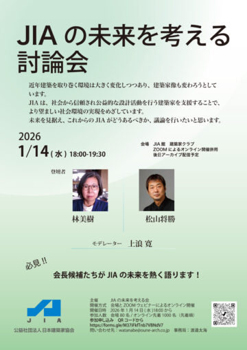 選挙を直前に控えた2026年1月14日(水)18時からJIA館建築家クラブで会長候補者を交えた公開討論会を開催します。